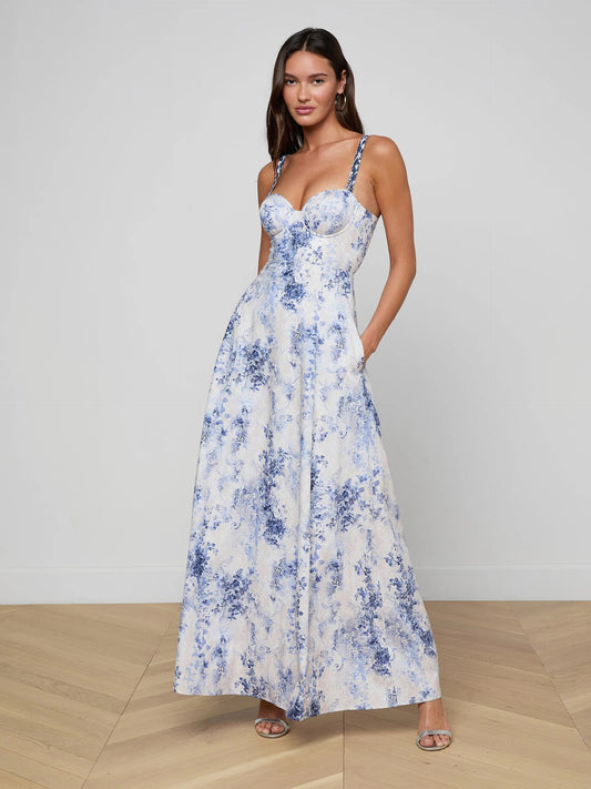 L'AGNCE - Women - Ivory/Blue Watercolor Lace Paisley Sutton Beaded Strap Gown