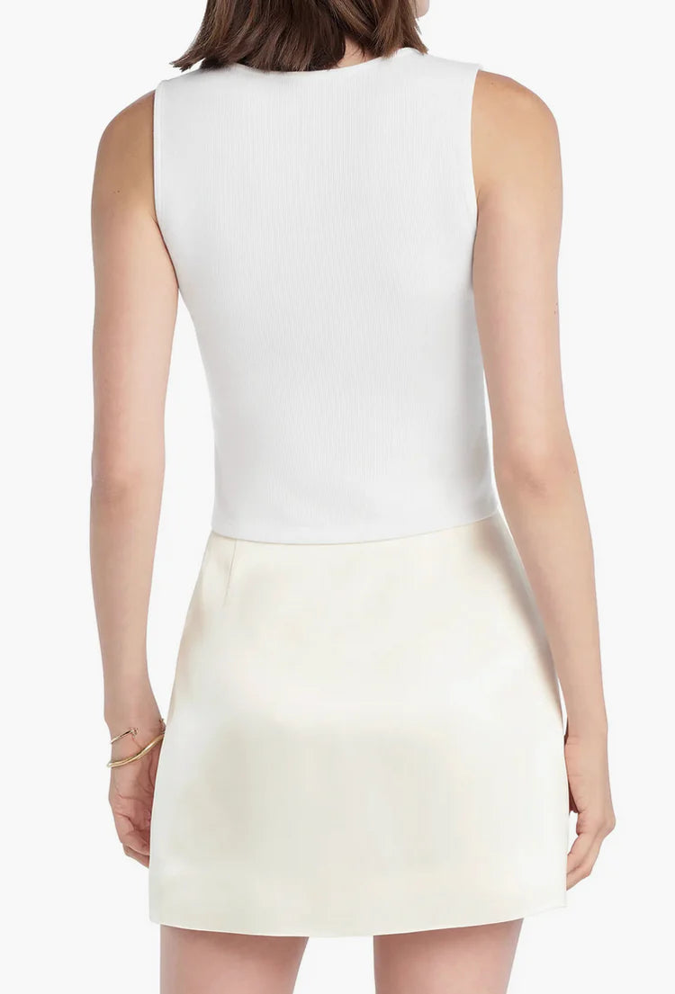 Allover ribbing lends a close fit to this cropped front-button top cut in a sleeveless silhouette.