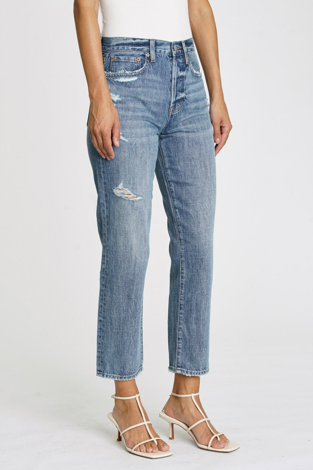 The Charlie is a high-rise straight leg that hugs your waist and hips and is straight throughout. This easy medium wash style features an exposed button fly with slight distressing.