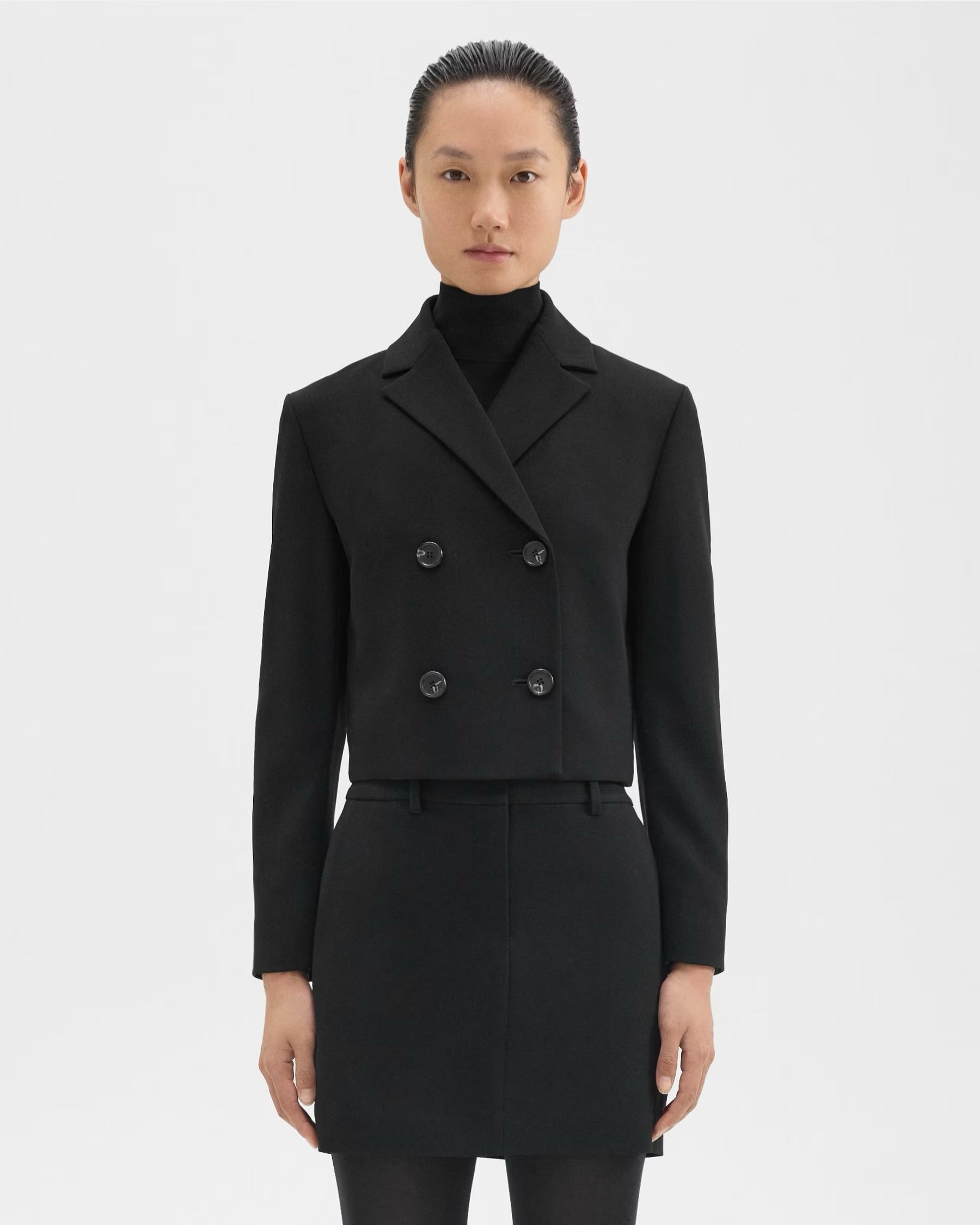 A classic style rooted in traditional tailoring, this cropped jacket is cut for a boxy silhouette with notched lapels. Punctuated with a double-breasted front, this version is cut from Theory''s signature Japanese Admiral Crepe for a softly draped fit that maintains a polished appearance. Great paired up with a skirt, over a dress, pants and jeans.